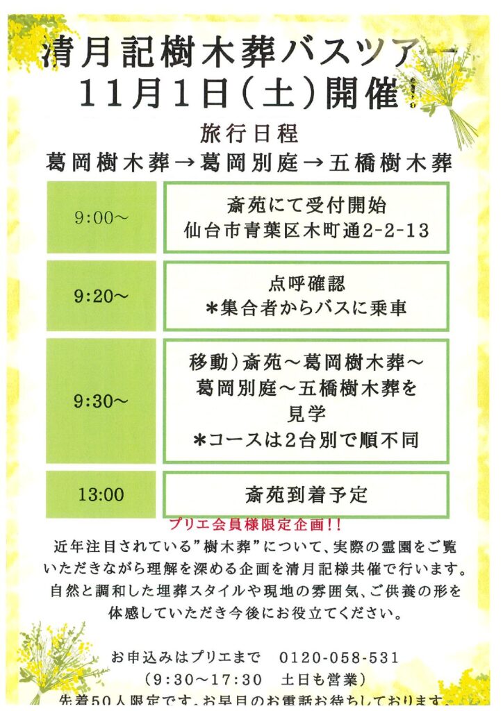 2025.09.21 樹木葬バスツアーのご案内 お知らせ この度、プリエ会員限定で樹木葬ツアーを開催いたします。 プリエ会員様限定で50名様の募集です。樹木葬をお考えの方はぜひこの機会にツアーにお申込み下さい。 まだプリエ会員ではない方も、今回プリエ会員にお申込みでバスツアーの参加が可能です。 詳しくは、添付チラシ、またはプリエ案内センターにお問い合わせください。 2025年9月21日 みやぎ生協 プリエ案内センター TEL0120-058-531 受付時間 9:30~17:30 前の記事へ 記事一覧