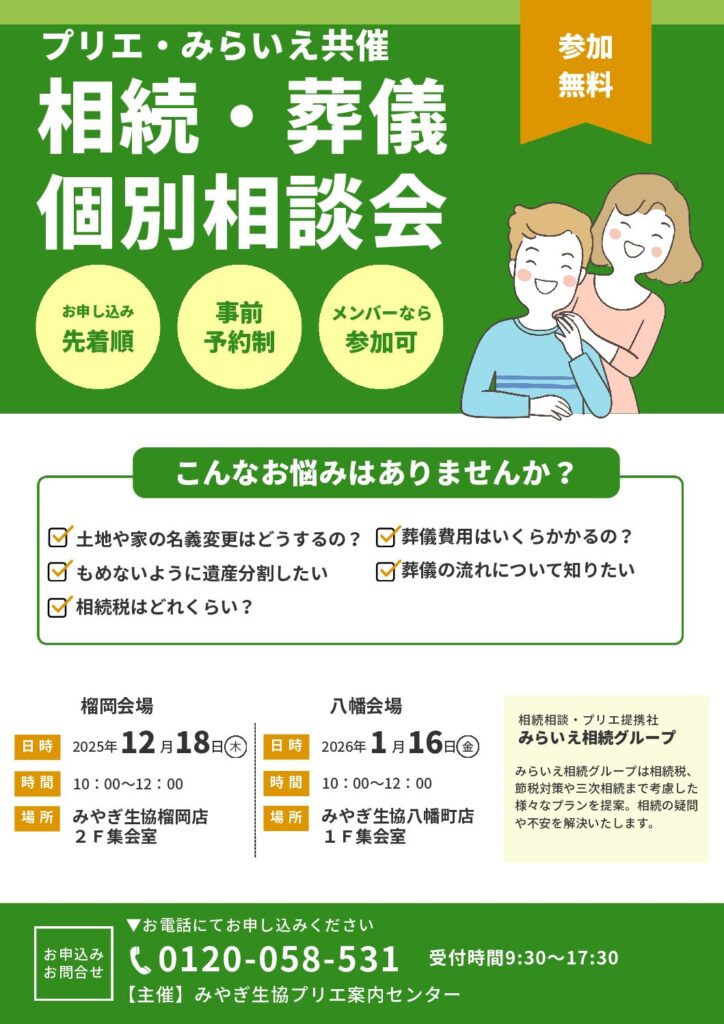 2025.11.04 相続・葬儀個別相談会の開催 お知らせ この度、相続・葬儀個別相談会を開催することになりました。 事前予約が必要で、お申し込みは先着順となります。 メンバー様・プリエ会員様なら、どなたでも受付可能です。 定員に達した場合は、お断りすることもございます。 詳しくは、プリエ案内センターにお問い合わせください。 2025年11月4日(火) お問い合わせ受付先 TEL 0120-058-531 受付時間 9:30~17:30 前の記事へ 記事一覧